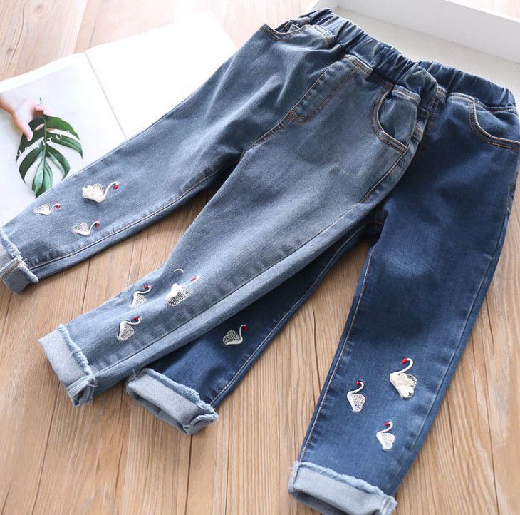 2019 الخريف أطفال جينز بنات لطيف سوان التطريز الدنيم السراويل الأطفال جيب مزدوج عارضة كاوبوي بنطلون ملابس الاطفال الكرتون F8441 2020 From Summervivi 322 60ر س موبايل بوابة Dh
